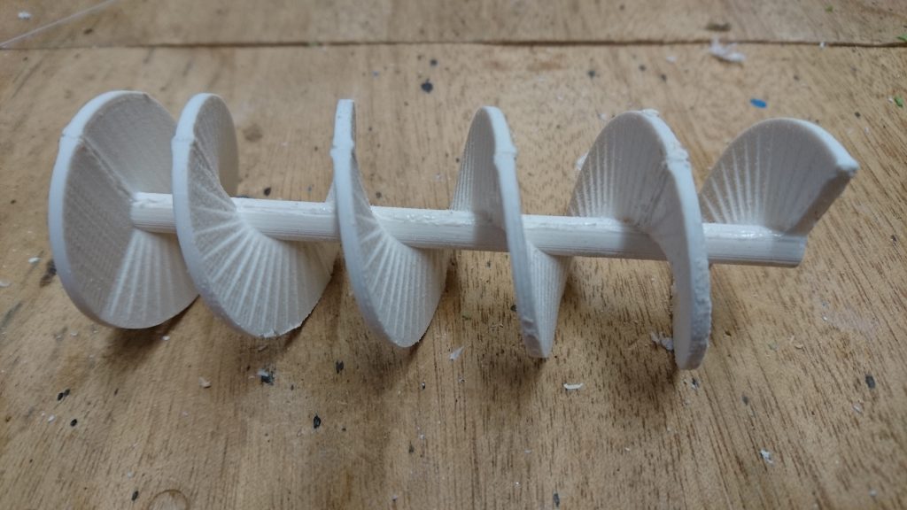 Pari viikkoa sitten otin projektin taas esille. Kaivoin moottorivarastosta tehokkaamman moottorin kunnon alennusvaihteella. Samalla printtasin myös uuden ruuvin, jonka nousu olisi paljon suurempi. Kuvassa yläpuolella on uusi ruuvi ja alapuolella vanha. Uusi, ”harvempi” ruuvi kuljettaa hiutaleita vanhaa ruuvia tehokkaammin.