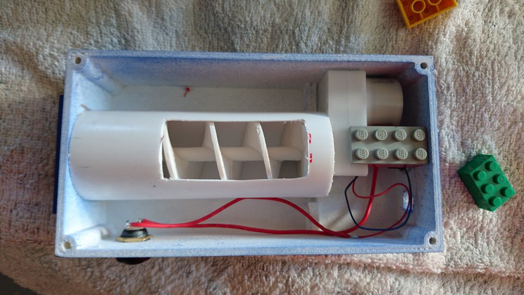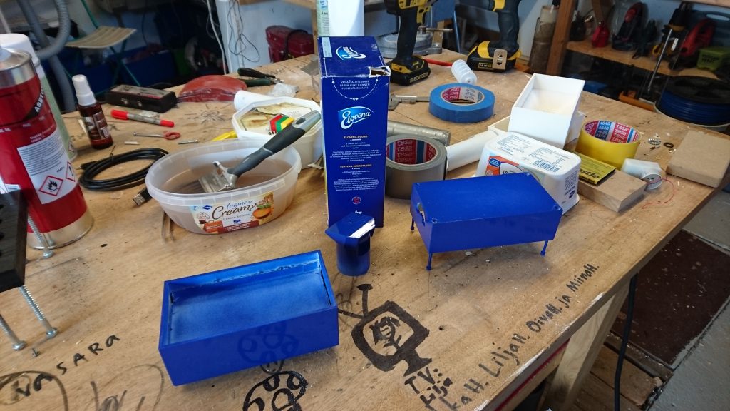 Tässä vaiheessa en vielä huomannut, että moottori oli aivan liian alitehoinen hiutaleiden siirtämiseen. Maalasin kaikki osat Eloveenansinisellä, jota sattui löytymään Bauhaussista 🙂